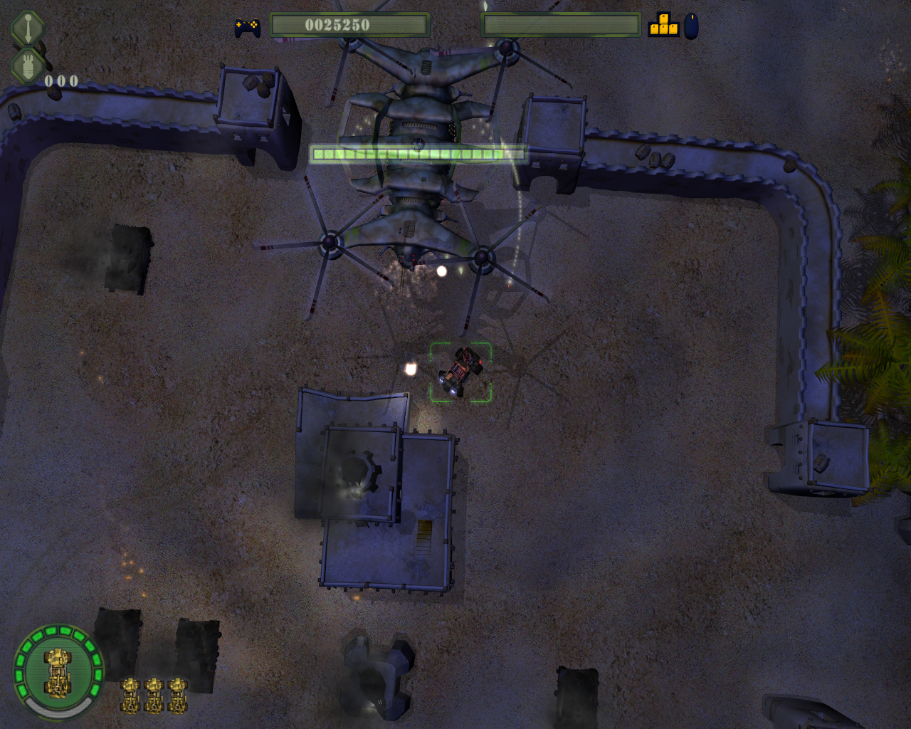 Egal, rein ins Spiel, lassen wir es krachen. Aber was ist das? Sobald ein paar Gegner auf der Bildfläche erscheinen, zuckelt das Spiel wie in Zeitlupe über den Bildschirm. Okay, also nichts wie rein ins Konfigurationsmenü. Doch sogar mit minimalen Einstellungen leidet die Spielgeschwindigkeit immer noch unter Framerateneinbrüchen. Dank fettem Streaming-Stocken bleibt das Bild außerdem gerne mal mitten in der Action stehen. Sowas gab es in der guten alten Amiga-Zeit nicht! Außerdem ließen sich die Fahrzeuge damals elegant durch die Schussalven der Gegnerschar hindurchmanövrieren. Im Remake reagiert vor allem der Heli reichlich träge. Das ist zwar realistischer, macht aber weniger Spaß, als eine exakte Digitalsteuerung. Der einzige Lichtblick sind die zwei Feuermodi, denen das Spiel seinen Namen zu verdanken hat. Mit beiden Fahrzeugen schießt ihr je nach gedrücktem Feuerknopf auf Gegner am Boden oder in der Luft. Je schneller ihr mit dem Heli Gas gebt, desto dichter schlagen die Luft-zu-Boden-Geschosse vor euch auf dem Boden ein. Diese Technik ist ungewohnt, lässt sich aber mit etwas Übung einigermaßen beherrschen. Außerdem haben die Entwickler sich den Looping aus Banshee, einem anderen Amiga-Klassiker, ausgeliehen. Während ihr das Flugkunststück vollführt, können euch die Gegner kein Haar krümmen.
