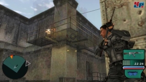 Der vielseitige Agent steigt außerdem auf Kisten, hangelt sich an Vorsprüngen entlang und benutzt eine Winde, um sich an Seilen entlang zu hangeln. Ausgesprochen lässig: Während er mit einer Hand an der Winde hängt, ballert er sich mit der anderen den Weg frei. Dabei haben die Entwickler an alles gedacht. Es kann z.B. passieren, dass ihr – fast am Ende eurer Kräfte – vor einer Tür steht und wisst: Dahinter lauert ein schwer bewaffneter Soldat. Würdet ihr den Eingang langsam öffnen, erledigt euch der Miesling dann schon beim Heraustreten.