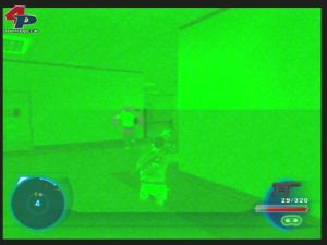 | Wer auch im Dunkeln sehen kann, ist klar im Vorteil: Dank Nachtsichtgerät erscheinen euch die düsteren Bürokorridore taghell. |