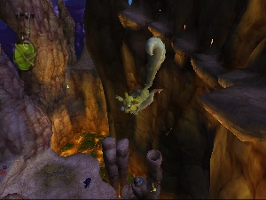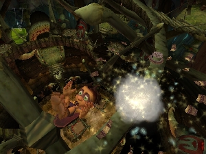 In späteren Leveln wird es Tak sogar möglich sein, sich mittels Juju-Energie selbst für kurze Zeit in Tiere zu verwandeln, sobald man die dafür notwendigen Totems gefunden hat. Das Hauptziel eines Levels in der „Wach-Welt“ besteht meistens daraus, zunächst einen Juju-Schrein und anschließend ein Juju-Tiki zu finden, mit dem man den entsprechenden Juju erwecken kann. Dann nur noch eine kleine Aufgabe erledigt und es kann weiter gehen. Gerade bei den mitunter sehr skurrilen Jujus und den Zwischensequenzen kommt der Humor nicht zu kurz, der aufgrund einiger zweideutiger Bemerkungen nicht nur Kinder anspricht. Oft geht der Schuss allerdings nach hinten los, da die Entwickler versuchen, krampfhaft lustig zu sein, es aber irgendwie trotzdem nicht schaffen. Dennoch gibt es genügend Situationen, in denen man sich ein Grinsen einfach nicht verkneifen kann, so z.B., wenn Möchtegern-Held Lok vom Wahrsager-Juju durch den Kakao gezogen wird oder das nervige Todes-Juju Parties feiern will. Insgesamt ähneln sich die Struktur und die Ziele in den einzelnen Level sehr stark, sodass auch der Wachzustand von Tak 2 leider nicht sonderlich abwechslungsreich ausgefallen ist, allerdings durch den Floh- und Tiereinsatz deutlich mehr Spaß macht als die vermurksten Traum-Abstecher. Außerdem dürft ihr euch zwischendurch mit einem Holzfass oder Kanu auf eine feucht-fröhliche Wildwasserfahrt freuen, mit denen der Held wenigstens für kurze Zeit aus seinem Hüpfalltag ausbrechen kann – auch wenn hier die viel zu wilden Kameraschwenks für Verwirrung sorgen.