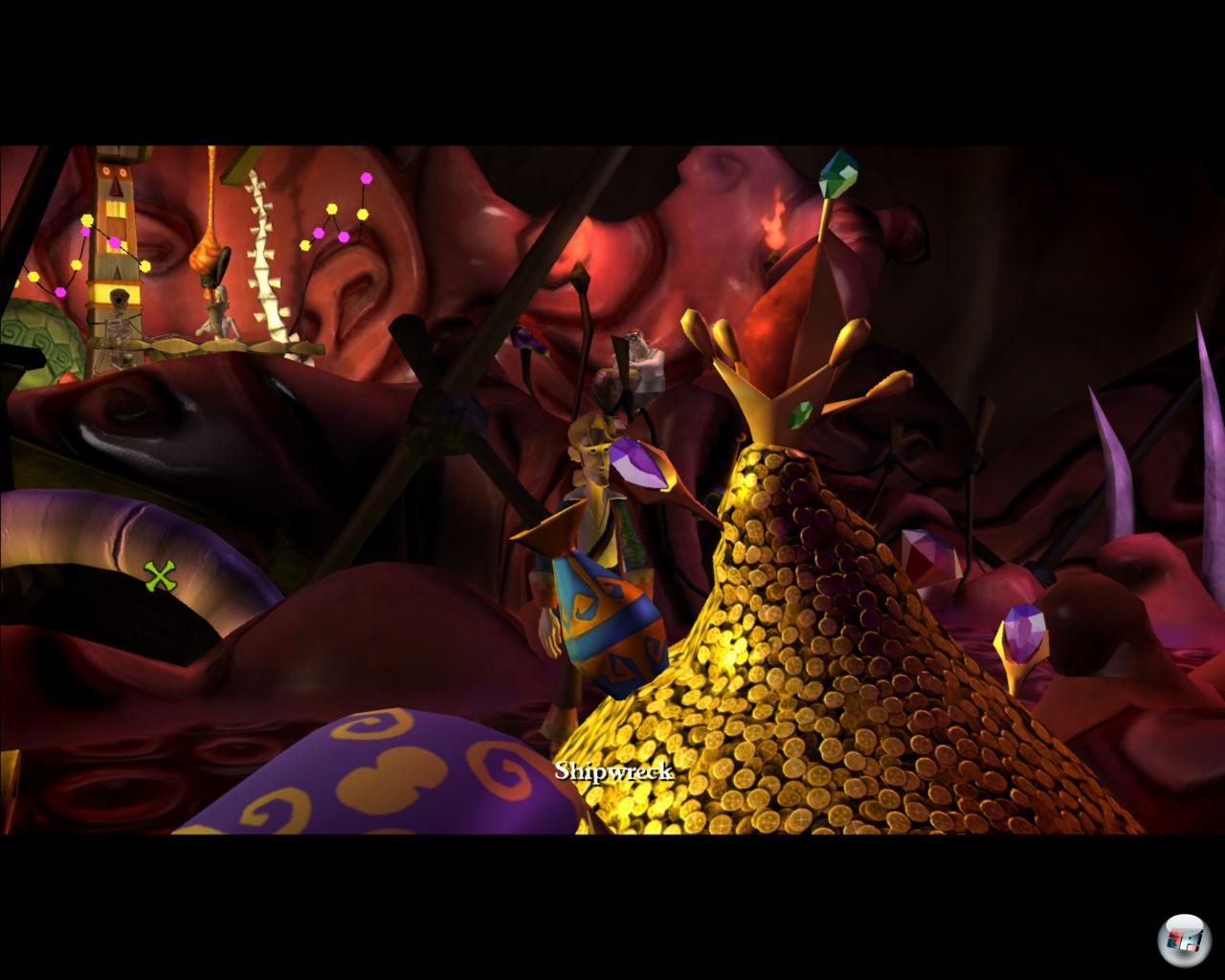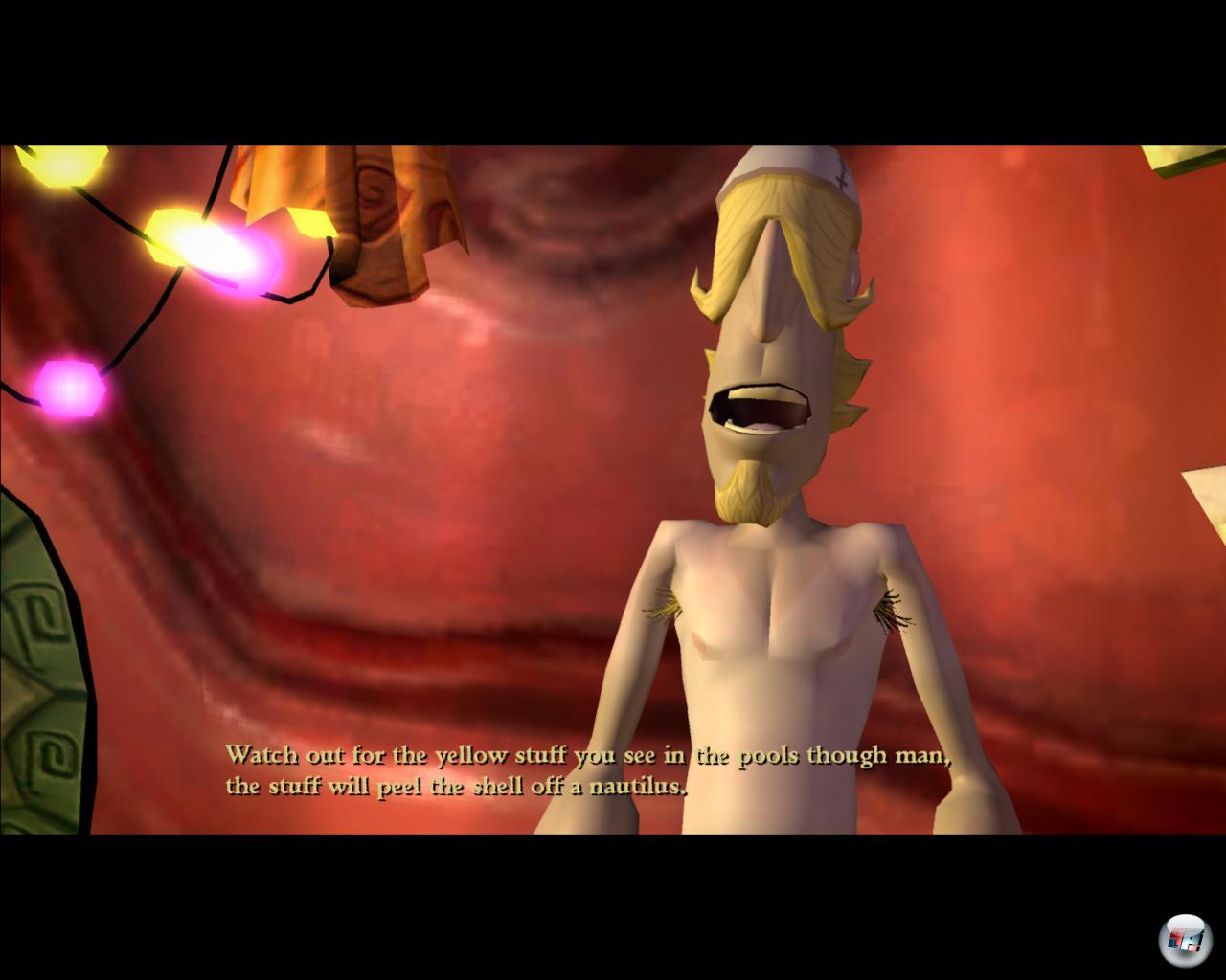 Seekuh durch Tales of Monkey Island, die im Spiel nur Manati (Englisch Manatee) heißt. Wer nicht weiß, was das sein soll: Es sind absolut friedfertige Meeressäuger, die sich in der karibischen See vergnügen, Seegras mümmeln und unter Naturschutz stehen. Wie dem auch sei: Der Held von Tales of Monkey Island trägt als Talisman das so genannte Auge des Manati mit sich herum und dieses Mal kommt man den schwerfälligen Viechern auf jeden Fall noch näher, denn Guybrush wird gleich von einem Riesenmanati verschluckt. Samt Piratenschiff und Mannschaft strandet er, soweit man das im Magen eines Tiers sagen kann.