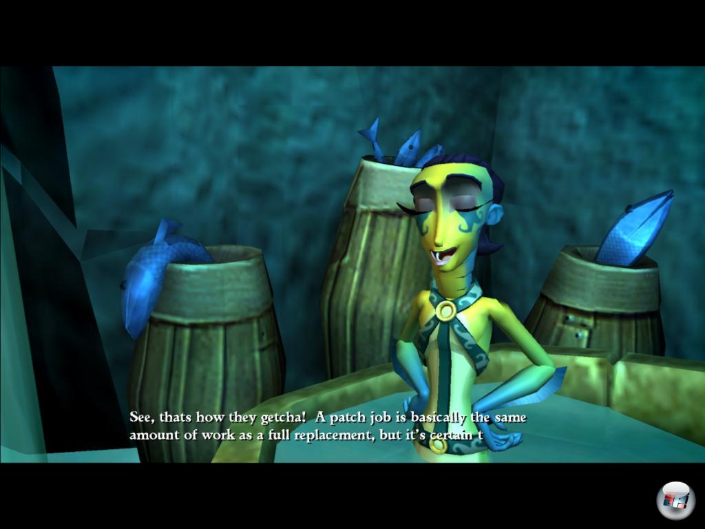 gleich auf der nächsten Insel, die man Maat Winslow ansteuern lässt. Doch das ist nicht etwa das Happy End, sondern der Auftakt für eine weitere Suche nach dem Voodoo-Artefakt, die zwei bis drei Stunden dauert. Wie zuletzt von der Wahrsagerin geweissagt, braucht der Held das ominöse Espunja Grande, um endlich die Seuche zu besiegen, die die meisten Piraten in aggressive Aussätzige verwandelt hat. Das erfährt er auf der Inselgruppe Spinner Cay, wo ein Volk von Meerjungfrauen haust. Jungfrauen klingt gut, aber so sicher ist er leider nicht, ob es nun Männlein oder Weiblein sind: Sie sehen zwitterhaft aus und haben Clownsstimmen.