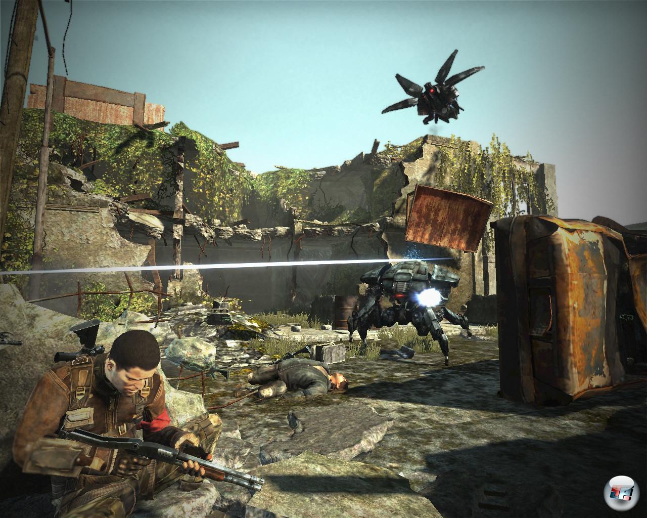 durch das von vorn bis hinten streng lineare Spiel abgehakt, kann man das Ganze lediglich auf einem höheren Schwierigkeitsgrad nochmal erledigen. Vielleicht sogar zusammen mit einem Freund, der kein Problem mit einem Splitscreen hat – Online-, Netzwerk- oder sonstige Multiplayermodi gibt es nicht. Die Splitscreen-Variante ist insofern unterhaltsam, als dass sie Army of Two-kompatibel Teamwork belohnt: So lange einer von beiden am Leben ist, kann er den anderen jederzeit reanimieren – erst wenn beide Spieler Opfer der Maschinen werden, geht’s zum letzten Checkpunkt zurück.