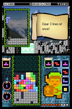 Zeitlimit. Die »Mission« findet im fernen Hyrule statt: Hier bekommt ihr eine Aufgabe wie »Baue mit diesem Teil zwei Reihen gleichzeitig ab« oder »Beseitige alle Reihen, ohne ein Teil zu drehen«, und habt dann ein mit stetig weniger werdenden Zelda-Herzen dargestelltes Limit Zeit, selbiges zu lösen. Bei »Touch« kommt endlich mal der Stylus zum Zuge, denn hier sollt ihr einen bestehenden Klotz-Berg von unten abbauen, indem ihr mit dem Stift die Teile so verschiebt, dass sie nachrutschen und verschwinden. Auch dieser Modus ist nichts für Hektiker, stattdessen solltet ihr euch für die Entscheidungen Zeit lassen – man ist schneller zugebaut, als man denkt! Der letzte Modus ist schließlich der von Gastgeber Donkey Kong präsentierte »Druck«, eine Art Tetris-Battle: Ihr beginnt in der Mitte des Spielfelds und versucht den Gegner, KI oder Mensch, mit geschickt abgebauten Klötzen auf seine Seite zu schieben – wer zuerst dort landet, hat verloren. Hektik pur! Jeder Modus ist seinerseits noch teilweise in leicht andere Varianten unterteilt, so dass nicht so schnell Langeweile aufkommen sollte.