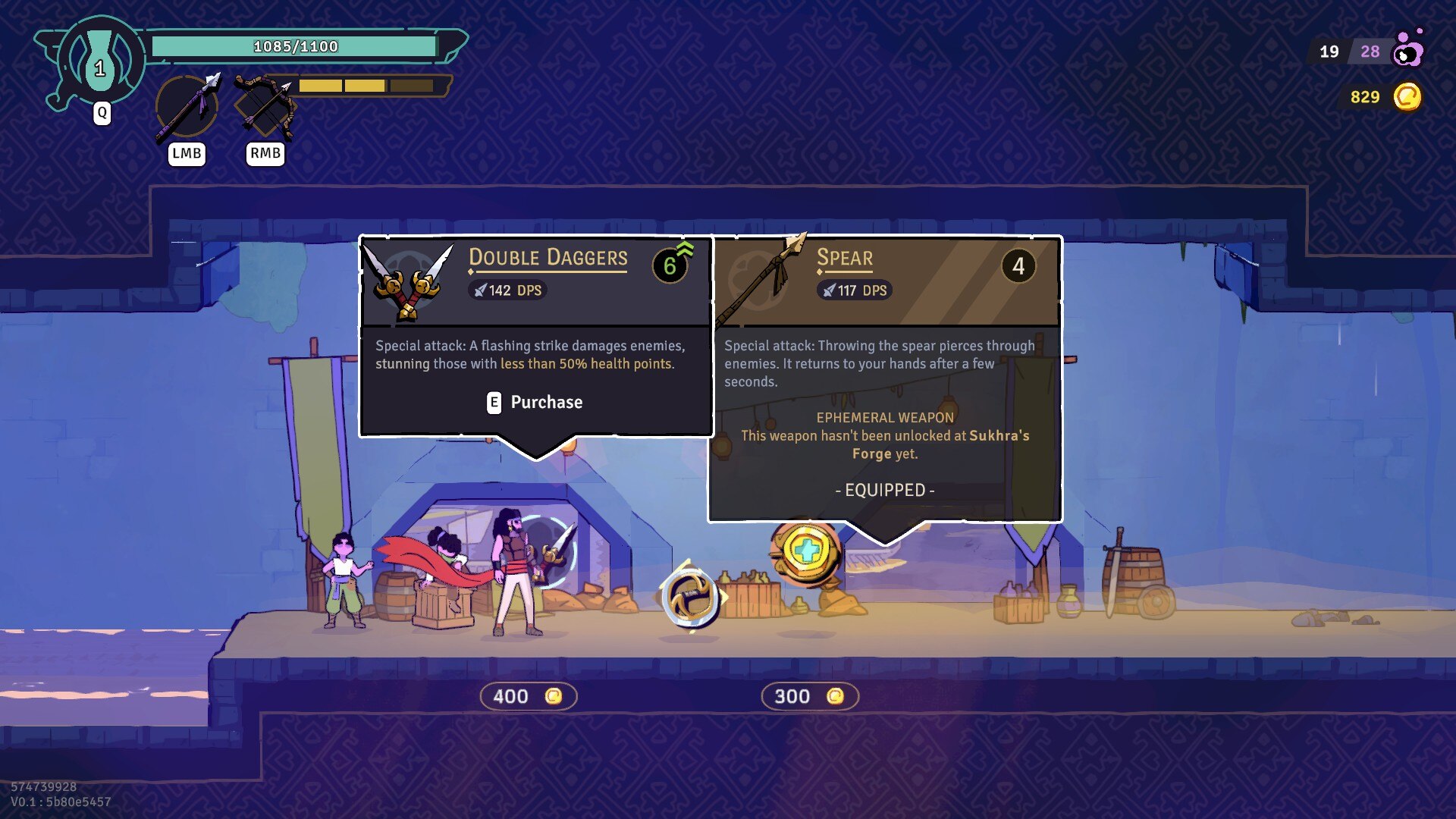 Zu Beginn eines Versuchs habe ich jedoch erst einmal nur die Dolche in der Hand. Neue Waffen gibt es unterwegs, etwa in dem sie auf Podesten angeboten werden oder durch verstreute Schatzkisten. Alternativ stolpere ich über zwei junge Händler, die mir für die eine oder andere Goldmünze ihr Angebot überlassen. Praktisch: Die jeweiligen Schadenswerte lassen sich direkt über einen Tooltip vergleichen, man muss nicht lange in irgendwelchen Menüs herumfummeln.