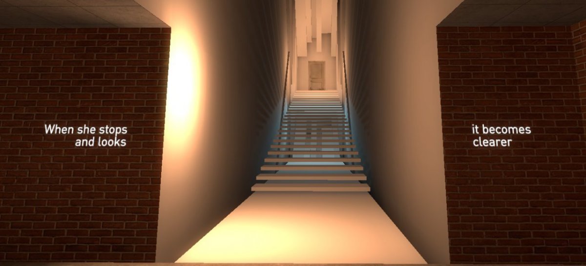Also zeigt er mir Codas Spiele; zunächst eine Art Counter-Strike-Level, dann simple, später aufwändigere Levelbausteine, Labyrinthe, Raumschiffe. Er interpretiert sie, während ich durch die einfachen, emotional zum Teil eindringlichen Abschnitte laufe. Mehr muss ich nicht tun. Mal ändert sich die Umgebung, wenn ich mich umdrehe, ein andermal betätige ich einen Hebel und gelegentlich antworte ich den symbolhaften Figuren in Codas Abenteuern.