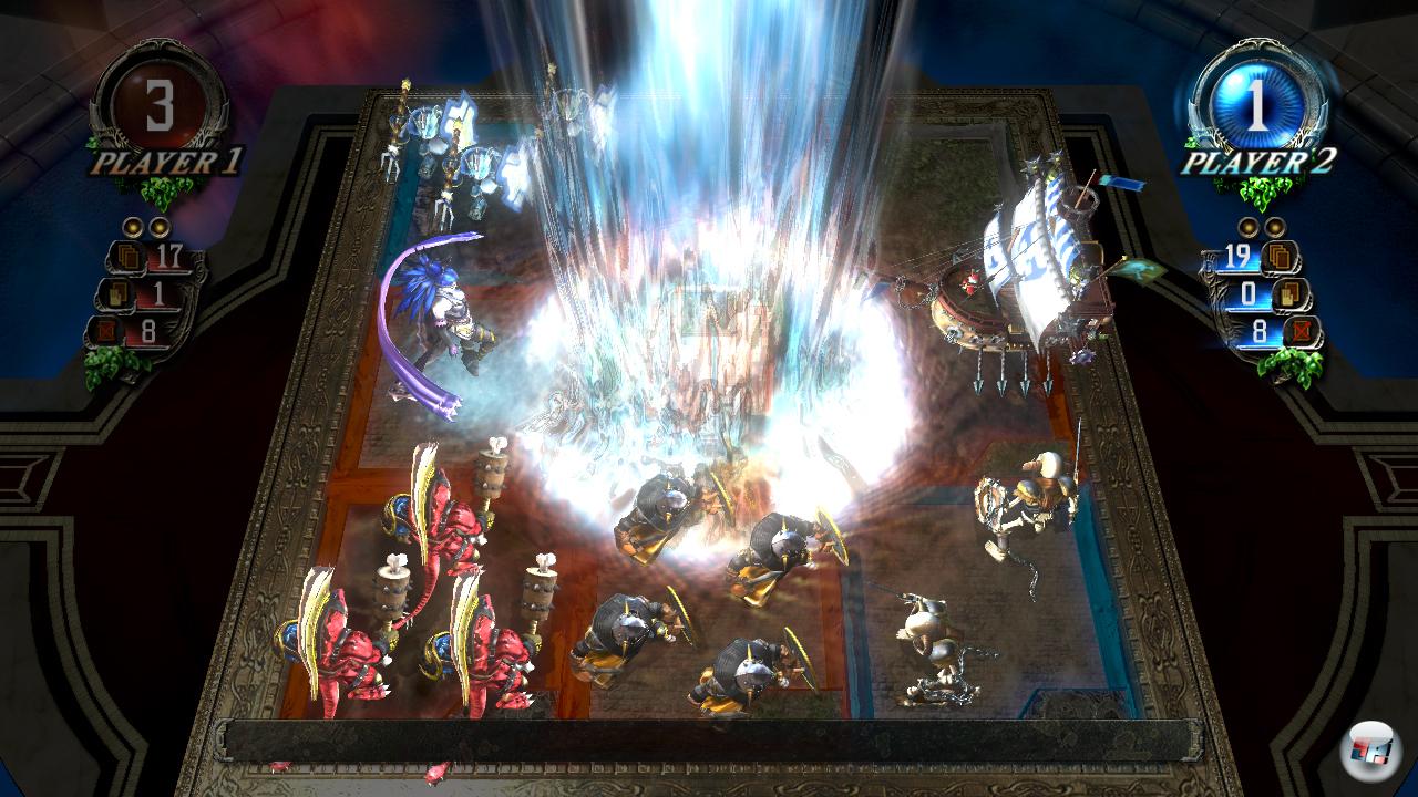 Die Präsentation ist überaus ansehnlich, aber wie ist das Spiel? Oben habe ich mit dem Skelett auf der Hand nur den Kartenbetrachtungsmodus „Card Profiles“ beschrieben, aber erst in einer der sechs Kampfarenen geht es richtig zur Sache. Ihr könnt entweder passiv Schaukämpfe der KI beobachten oder aktiv gegen einen Freund bzw. gegen den Computer in fünf Schwierigkeitsgraden antreten. Übrigens: Besiegt ihr ihn auf der dritten oder einer höheren Stufe, wird ein Kartendeck freigeschaltet, das ihr im Editor bearbeiten könnt. Das Problem ist nur, dass die KI schon ab der dritten Stufe richtig klug agiert und ihre Karten optimal platziert; was wiederum die Langzeitmotivation erhöht.
