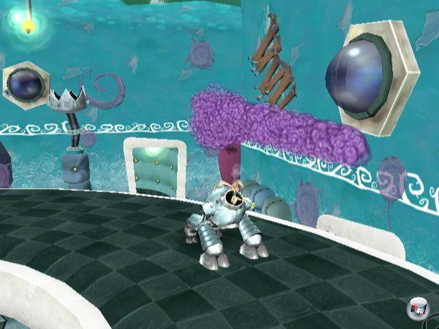 Statt solche Schwachstellen im Spieldesign auszubessern, haben die Entwickler das Problem in der Wii-Version übrigens noch durch das Einbinden unnötiger und ungenauer Gesten-Kommandos verschärft. Um z.B. mit Pixie als Balletttänzerin über weite Abgründe zu schweben, muss ich die Fernbedienung aufrecht halten und krampfhaft um die eigene Achse drehen. Die mit Hund Rex spielbaren Minigames lassen sich glücklicherweise viel entspannter zocken: Steckt der kleine Kläffer in der Steuerzentrale des Anzugs, kann er mit Hilfe seiner exragroßen Ohren Tresorschlösser knacken, die Gespräche diverser Gegner ablauschen und flott durch die Levels wetzen. All das funktioniert mit Hilfe feinfühliger Stickbewegungen. Außerdem wittert er als violette Wolken dargestellte Fährten: Einfach ein paar mal auf den Schnüffelknopf drücken und schon führt ihn die Duftwolke ans Ziel. Nützlich ist auch sein Jaulen, mit welchem er die skurrilen Widersacher kurzzeitig außer Gefecht setzt.