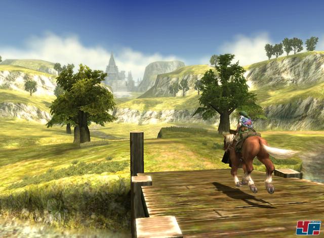 Der Vorspann und das Hauptmenü können wie eine Vorgruppe für eine Rockband wirken: Sie machen Stimmung und wecken die Lust auf mehr. Das funktioniert auch in Zelda: Wenn Link auf seinem Pferd ins Abendrot donnert, an tiefen Abgründen und monumentalen Brücken vorbei, von lieblichen Melodien begleitet, dann verströmt der Wii plötzlich einen Hauch von Shadow of the Colossus <a class="DYNLINK" onmouseover="DynToolTipp_Show('Klicken für Gameinfos‚)“ onmouseout=“DynToolTipp_Hide(); “ href=“javascript:DynCont_Display(‚Gamefinder‘,’runmod.php?sid=%7BSID%7D&LAYOUT=dyncont_gf&spielid=3105′)“>