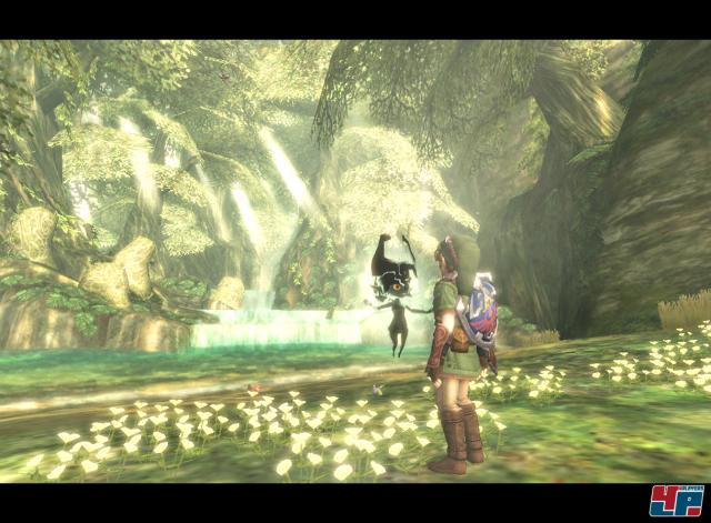 Nicht zu vergessen der typisch japanische Humor, der Pathos und Heldenmut immer wieder unterbricht: Da schwenkt ein Affenrüpel seinen roten Hintern in die Kamera oder ein Postbote rennt mit Fahne und weißer Unterwäsche über die Ebene von Hyrule – abgefahren, witzig oder daneben? Auf jeden Fall stört es die Atmosphäre nicht, die ein paar Sekunden später wieder traurig oder tragisch sein kann. Doch so düster ein Landstrich auch wirken mag, auf den schwarzer Schnee zu fallen scheint, gibt es immer wieder Lichtblicke. Und sei es nur Midnas keckes Lachen, das euch meist einen Hinweis gibt, wo es weiter geht, wo geklettert werden kann. Der kleine dämonische Sidekick ist unheimlich wichtig für das Spiel, denn er hält die Neugier wach und bildet einen Gegenpol zur lichten Welt: Was will Midna eigentlich mit den Teilen der Schattenmaske? Wieso hilft sie euch überhaupt? Und warum macht sie Prinzessin Zelda für das Unheil verantwortlich?