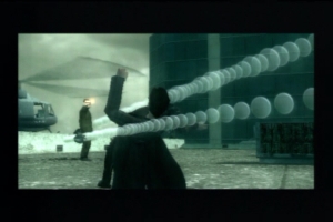 Die Matrix-Trilogie wäre nur halb so lang, wenn die vielen Actionszenen nicht mit cooler Bullet-Time gestreckt wären – und natürlich bemüht ihr auch hier euren linken Zeigefinger sehr oft mit dem Druck auf die Zeitlupen-Taste! Zack, wird die Geschwindigkeit des Spiels runtergefahren, ebenso die Tonhöhe aller Geräusche, Schläge und Kicks tun optisch doppelt so weh, abgefeuerte Kugeln ziehen etwas sehr an Kondensstreifen erinnernde Spuren durch die Luft. Gerade in der Zeitlupe sieht es verdammt cool aus, wenn man wie mühelos solide Betonpfeiler einfach zerbröselt, damit die nähere Umgebung in einen Dunstwall taucht, nach einer langen Kombo auf den Gegner zuspringt und ihn mit einem kraftvollen Kick die Visage verbiegt.