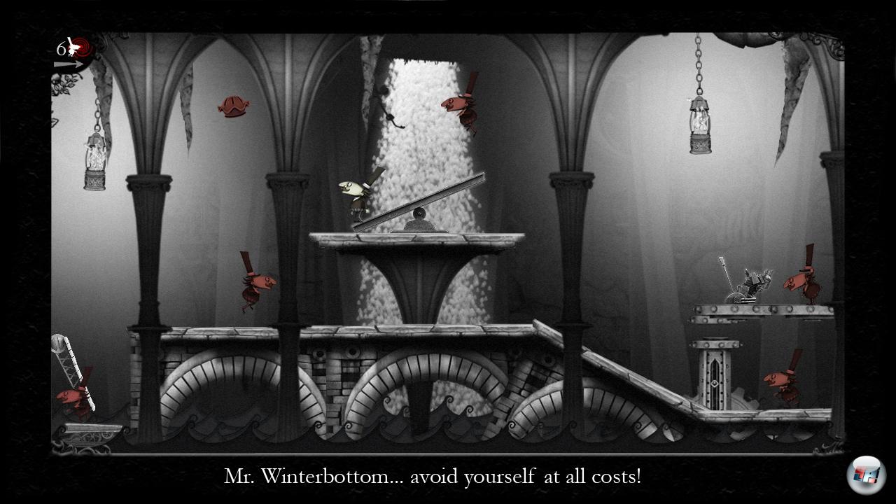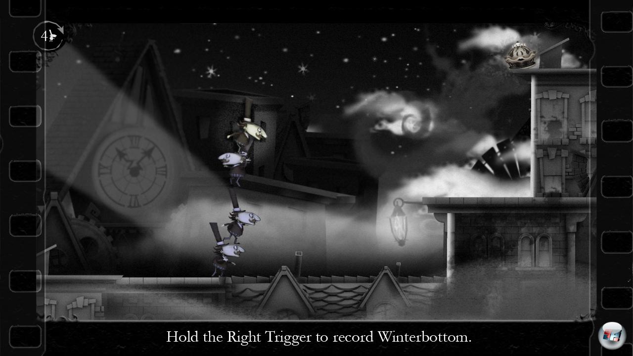 Schon die Levelauswahl wirkt wie eine Hommage an Braid: Während ich mit meinem Helden durch die Filmtheater-Oberwelt hüpfe, klappen zwar keine Bücher auf, doch die Anordnung der Level-Eingänge erinnert sofort an an des Vorbild. Auch stilistisch erweisen sich die »Odd Gentlemen« als ähnlich experimentierfreudig wie Blow: Statt an plattformtypischer Knuddel-Ästhetik orientiert sich das Design an alten Stummfilmen. Während im Hintergrund stilecht das Piano klimpert, hüpft der mit Schnauzbart und Zylinder ausgestattete Protagonist vor riesigen Zahnrädern, Fließbändern und Schaltermechnismen umher – fast wie in Charly Chaplins Industriekritik Moderne Zeiten.