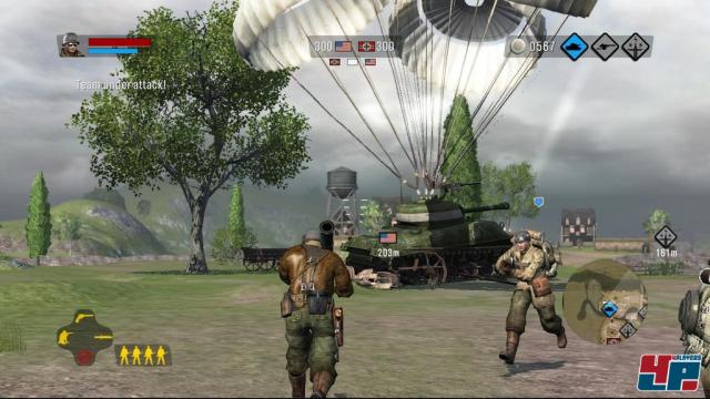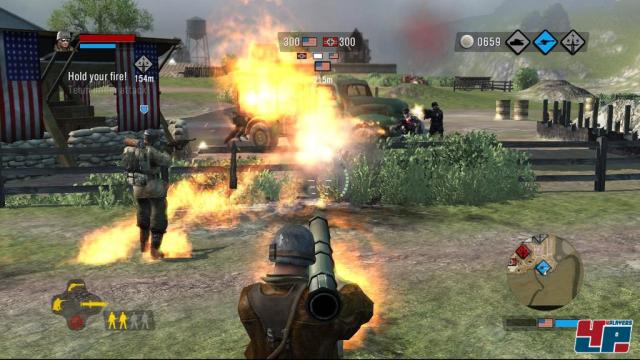 Ihr zieht nicht nur zu Fuß gegen die feindlichen Truppen ins Feld: Mit bewaffneten Jeeps, Kettenfahrzeugen, schweren Panzern und anderen Vehikeln macht ihr euren Feinden das Leben zur Hölle, zerstört Absperrungen oder jagt ganze Gebäude in die Luft. Stehen nicht zufällig unbenutzte Fahrzeuge auf den Schlachtfeldern herum, könnt ihr diese auch selbst anfordern. Voraussetzung ist jedoch, dass ihr zuvor bereits den Fuhrpark der Nazis eingenommen habt und über genügend Kleingeld verfügt. Letzteres bekommt ihr für jede getötete Einheit sowie das Erreichen von Missionszielen auf einem Konto gutgeschrieben. Neben Fahrzeugen habt ihr zudem die Möglichkeit, Flak-, MG- und Artillerie-Geschütze zu kaufen, mit denen sich bereits eroberte Gebiete optimal verteidigen lassen. Schöner Nebeneffekt: Jedes Geschütz kommt mit einem weiteren Soldaten daher, so dass euch neben den vier Begleitern weitere Man-Power zur Verfügung steht. Sämtliche Einheiten werden umgehend durch die Luftunterstützung geliefert und stehen bereits innerhalb weniger Sekunden zur Verfügung. Doch auch die Nazis verfügen über eine hervorragende Logistik und erfreuen sich ebenfalls an kontinuierlichem Nachschub aus der Luft – seien es Soldaten oder Fahrzeuge. Folglich ist auf dem Schlachtfeld immer was los und es knallt, brummt und schreit aus allen fünf Soundkanälen, so dass ihr jederzeit den Eindruck habt, euch mitten im Krieg zu befinden. Für einige Lacher sorgt dabei die Synchronisierung: Eigentlich stehen neben der gelungenen englischen Sprachausgabe lediglich übersetzte, aber durch den Hintergrund manchmal schlecht lesbare Untertitel zur Verfügung. Da ihr jedoch gegen Deutsche kämpft, haben es sich die Entwickler nicht nehmen lassen, die Feinde in unserer Muttersprache sprechen und vor allem fluchen zu lassen, wobei ihr verdächtig oft das bekannte S-Wort zu hören bekommt.