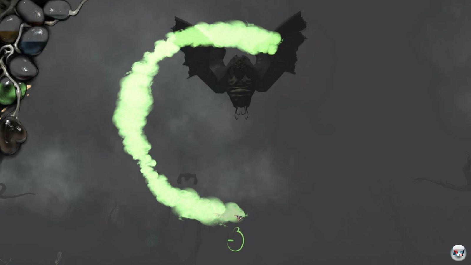 Meine pechschwarzen Widersacher erinnern an verkohlte Walrösser, Fledermäuse und Face-Hugger aus der Alien-Trilogie. Sie entstehen z.B., wenn ich unvorsichtig bin und Farbe verschütte. Wenn ich den Weg frei machen will, darf ich gegen sie kämpfen, muss es aber nicht. Auch die Auseinandersetzungen werden mit dem Pinsel ausgefochten. Entweder ich überschütte den Gegner mittels Mauszeiger plump mit Farbe, bis er leblos am Boden zappelt, oder ich zeichne eine der erlernbaren Glyphen, um ihn mit diversen farbigen Spezialwaffen wie einem zielsuchenden »Golem« anzugreifen. Auch ein Schild lässt sich zur Verteidigung malen. Leider laufen die Kämpfe ähnlich träge ab wie der Rest des Spiels.