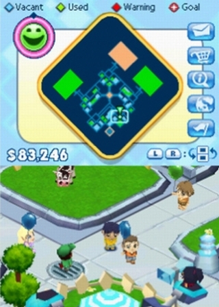 Unabhängig davon müssen natürlich auch Fahrgeschäfte wie Achterbahnen gebaut und dürfen im Selbstversuch getestet werden. Nur dass man am DS weder selbst das Lenkrad greift noch in der Gondel Platz nimmt. Stattdessen sehe ich mein Alter Ego einsteigen, eine kurze Runde drehen und wieder aussteigen – aufregend! Dass der Handheld keine aufwändige dreidimensionale Kulisse in den Bildschirm brennt, ist verständlich. Aber musste DC die Zügel so straff anziehen? Zumal auch das Erforschen meiner Areale kaum Spaß macht. Zum einen läuft mein Comic-Ich so gemächlich durch den Park, dass ihm die Füße wegen Vernachlässigung einschlafen und zum anderen zeigt die Darstellung viel vom Weg, stellt aber kaum eine Attraktion, geschweige denn mehrere, komplett dar – der „Guck‘ mal, was ich gebaut habe!“-Effekt fehlt. Es ist cool, seinen eigenen Park zu kreieren, aber das freie Herumtollen geht zwischen dem Abklappern vorgekauter Aufgaben unter.
