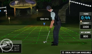 Das Putten selbst geht dabei nicht so flott von der Hand, wie es Konsolenprofis gewohnt sind. Zum einen ist das Loch auf dem kleinen Schirm oftmals kaum zu sehen, so dass genaues Zielen nur über das umständliche Justieren der Kameraperspektiven funktioniert. Zum anderen, und hier sammelt die Handheldversion Pluspunkte im Vergleich zu den Konsolenbrüdern, zeigt die Putt-Kamera weniger deutlich, wo ihr hinschlagen müsst. Das liegt daran, dass sie mehr vom Rasen und kaum etwas vom Hintergrund zeigt, so dass ihr die Orientierung tatsächlich über das Grün suchen müsst. Apropos Kulisse: Optisch und akustisch präsentiert sich Tiger Woods auf der PSP in der von den Konsolen bekannten Hochform und stellt