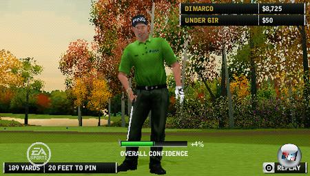 Ähnlich wie für die Version der großen Konsolen gilt auch für den Handheld: Woods präsentiert sich auf diesem System zumindest äußerlich sehr souverän. Immerhin spielt er auch auf PSP mit seiner Zuversicht – deutlicher sogar als auf den anderen Systemen. Denn wo die Anzeige sonst unbemerkt im Hintergrund berechnet wird, erfährt man hier nach jedem Schlag, um wie viele Punkte die Zuversicht steigt oder fällt. Je nach Risikofaktor des Schlags erhält man dabei eine unterschiedlich hohe Belohnung oder Bestrafung. Scheinbar setzt EA hier stärker auf den Faktor „Gerät anschalten, belohnt werden, Gerät ausschalten“, auch wenn sich eine Änderung dieses Status‘ wie bei den restlichen Fassungen nur geringfügig auf das eigene Spiel auswirkt.