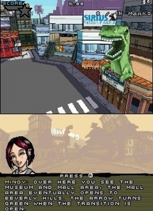 (AW): Ihr skatet durch L.A., trefft auf Mindy und lokale Besonderheiten wie den überdimensionierten Dinosaurierkopf. Allerdings startet ihr nicht als davon laufender Rookie, sondern werdet ob eurer Skate-Skills von Tony Hawk persönlich eingeladen, um noch besser zu werden. Anfangs scheucht euch noch Mindy durch die 3D-Szenarien, später quatscht ihr herumstehende Passanten für neue Missionen an. Insgesamt erwarten euch sieben