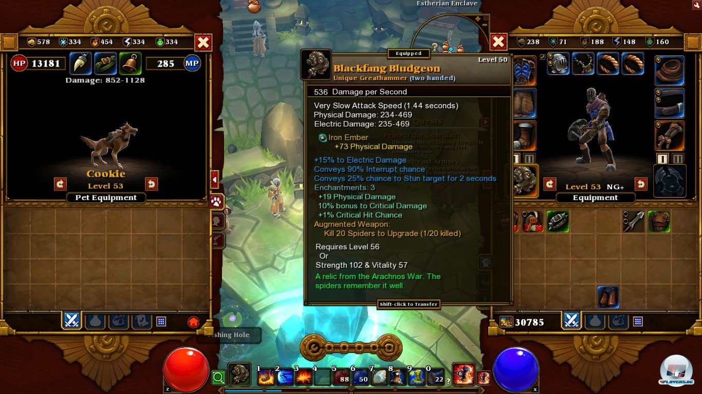 Und ja: Torchlight II ist auf „Veteran“ und „Elite“ kompromissloser und kniffliger. Für Kenner des ersten Teils und Diablo-Erfahrene sollte „Veteran“ daher die beste Wahl sein. Zum Glück stehen alle vier Schwierigkeitsstufen von Beginn an zur Verfügung, man muss das Spiel nicht erst durchgezockt haben, um Zugang zu höheren Herausforderungen zu haben. Man kann gleich auf „Veteran“ oder „Elite“ loslegen. Warum bei Diablo III kein ähnliches System zum Einsatz kam, bleibt ein Rätsel, denn automatisierte Aufstufungen und Level-Anpassungen der Gegner wären nicht das Problem.
