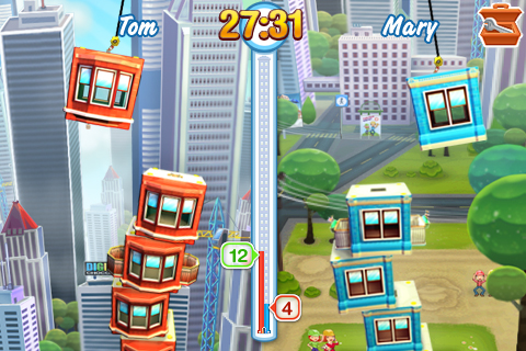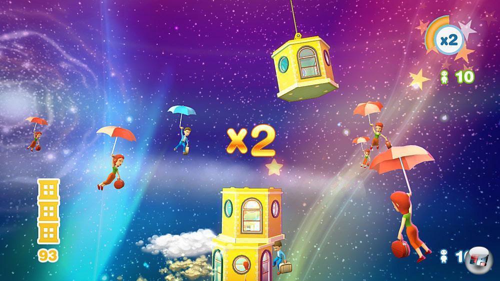 Auf Xbox 360 kann ich meine Leistungen hingegen auch online vergleichen und mich sogar mit bis zu drei Freunden vor einem Bildschirm messen. Zu zweit geht das auch am Wackel-Handheld; da nutzt dann einfach jeder Spieler seine eigene Bildschirmhälfte. Selbst im Duett haben Konsoleros allerdings die Nase vorn. Schließlich dürfen sie auch gemeinsam bauen: Während Spieler eins wie gehabt Stockwerke fallen lässt, korrigiert Spieler zwei nach, indem er links oder rechts eine Feder spannt, die anschließend die anvisierte Etage sanft zurechtrückt oder mit Karacho aus dem Turm haut – witzig! Eine Highscore-Liste führt die 360 sogar in meiner Karriere, für die ich möglichst viele Einwohner in drei (iP) bzw. vier (360) Bezirken meiner Stadt locken muss. Wie ich das anstelle? Natürlich, indem ich zahlreiche möglichst hohe Wohnhäuser baue – hier kommen die Bonus-Bewohner für präzise abgeworfene Etagen ins Spiel. Außerdem schalte ich nach und nach besondere Stockwerke wie Balkons oder Spezialdächer frei, in die noch einmal zusätzliche Mieter passen.