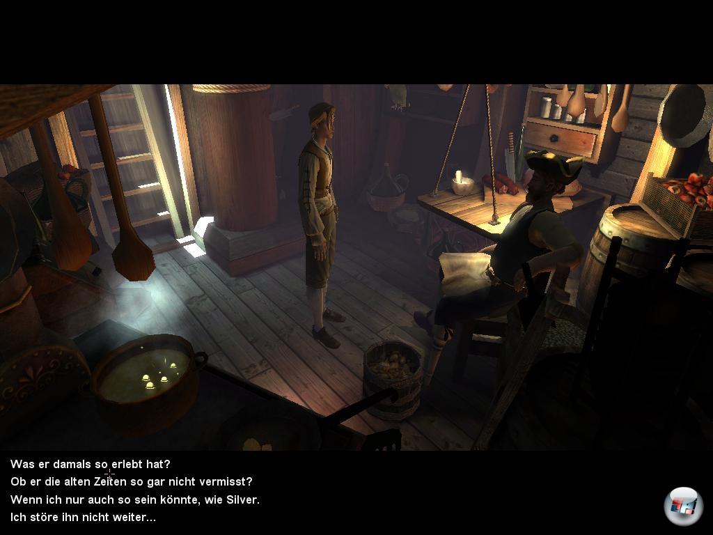 Diese Passage ist grob in der Mitte des von Radon Labs entwickelten 3D-Abenteuers angesiedelt, da sie das Ende des Kapitels auf See markiert. Sechs Kapitel gibt es insgesamt mit rund 10 Stunden Spielzeit, davon spielen die ersten drei gar nicht auf der Schatzinsel. Diese Vorgeschichte ist aber unter dem Strich besser als der etwas gekünstelt wirkende Schluss, da euch auch hier echter Piratenflair um die Nase weht. Etwa wenn ihr als Jim Hawkins Hochprozentiges an Bill Bones ausschenken müsst. Der Typ säuft ganz schön was weg und eure Vorräte schmelzen dahin wie Butter in der Sonne. Dann im zweiten Kapitel müsst ihr Seeleute anheuern, die eigentlich gar nicht mit an Bord wollen. Da ist List und Tücke gefragt.
