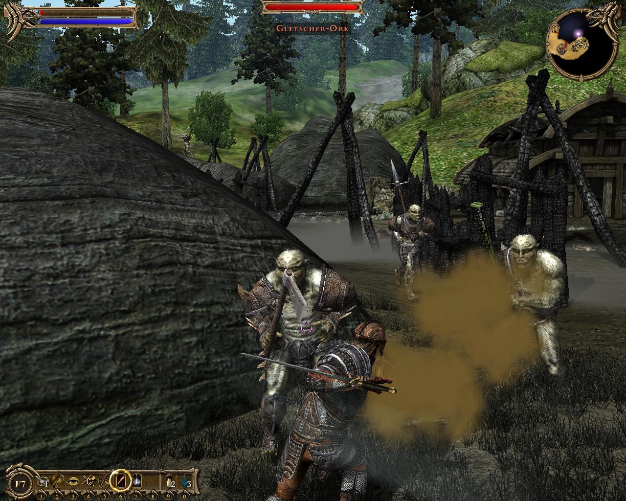Das Kampfverhalten scheint auf den ersten Blick besser als in Gothic und organisierter als in Oblivion: Wie in einem Echtzeitstrategiespiel attackieren euch Bogenschützen oder Magier aus der Distanz. Kommt ihr ihnen zu nahe, machen sie kehrt und versuchen Abstand für den nächsten Schuss zu gewinnen – das ist sehr gut. Denn in Two Worlds bedeuten feindliche Projektile oftmals den sofortigen Tod. Also heißt es: Gegner herauslocken, Deckung suchen, zuschlagen.