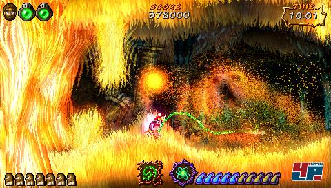 Neben den vielen, vielen, abwechslungsreichen und witzig animierten Standardgegnern begegnet ihr auf eurer meist von links nach rechts scrollenden Tour de Force auch regelmäßig extradicken Obermotzen – etwa einem fliegenden Etwas, das komplett aus Partikeln zusammengesetzt ist und somit fleißig überall herumwirbelt. Oder einem Sauron-kompatiblen Feuerauge, aus dessen umgebendem Flammenring brutzelige Greifarme kriechen und nach Arthur grabschen. Nicht zu vergessen der Schleimfrosch, der wuchtige Wasserdrache oder der eklige Käferdämon.