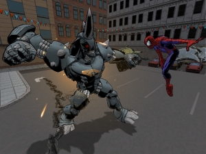 Die Rangeleien mit Shocker, Rhino, Green Goblin oder Electro sind großartig inszeniert und ziehen sich oftmals über mehrere Instanzen. Meist von einer Verfolgungsjagd eingeleitet müsst ihr nicht nur mit dem fliehenden Boss Schritt halten, sondern auch oft genug die Opfer des Pfades seiner Zerstörung retten – was natürlich die Verfolgung erschwert. Dafür drehen die Entwickler gerade in den Boss-Zwischensequenzen gehörig an der Humorschraube, denn wie in den Comics lässt es sich Spidey auch hier nicht nehmen, seine Widersacher gehörig zu beleidigen – ein Quell steter Freude, auch in der deutschen Version. Die englische Variante gibt es nur wahlweise auf dem PC zu hören, alle anderen Versionen sind rein Deutsch bzw. Französisch. Venom hingegen hält sich nicht lang mit Dialogen auf: entweder frisst er seine Gegner einfach oder er haut sie und die nähere Umgebung einfach zu Klump.