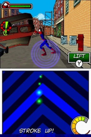 Legt Spider-Man eine Fußpause ein, schlüpft ihr in den glitschigen Anzug von Venom: Der kann sich nicht nur an Gegnern und Passanten laben, um seine Energie zu regenerieren, sondern auch mit seinen Tentakeln Objekte als Schild vor sich hertragen oder z.B. von einem Helikopter abgeschossene Raketen an den Absender zurückschmeißen. Allerdings dauert es eine Weile, bis solche Manöver gelingen, denn Venom wird sowohl digital als auch gleichzeitig analog gesteuert: Seine Bewegungen steuert ihr mit Digipad und den linken Schulterbutton, die Tentakel werden dagegen mit Touchpad und Stylus kontrolliert – so könnt ihr in alle Richtungen greifen. Allerdings erfordern diese Abschnitte einiges an Konzentration, speziell wenn man es mit mehreren Gegnern gleichzeitig zu tun bekommt.