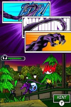 Ultimate Spider-Man entspricht technisch seinem Vorgänger (kein Wunder – selber Entwickler, selbes 3D-System), präsentiert sich allerdings im frischen Comic-Look: zackig animierte, farbenfrohe Figuren, verspielte Kamera, großartige Zwischensequenzen. Die Hintergründe sind DS-typisch reichlich verpixelt, was aber im Eifer des Gefechts kaum auffällt. Spielerisch folgt der Titel den 2D-Schwing-n-Run-in-3D-Pfaden des Vorgängers, bietet euch also im Grunde einen Sidescroller in 3D-Optik. Dankbarerweise wurde das Spielprinzip gestrafft, es gibt nicht mehr so viel unnützes Hin- und Hergelaufe wie vorher – und wenn doch, ist die Richtung zum Ziel deutlich markiert, ewiges Herumgesuche bleibt euch also erspart.