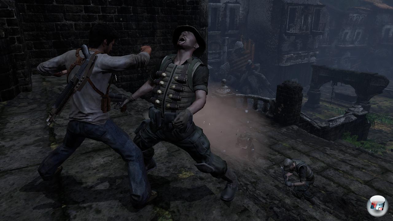 Auch die Dramaturgie kann letztlich noch einen versöhnenden Joker zücken: Es gibt etwa nach der Hälfte der Spielzeit endlich eine kleine atmosphärische Überraschung, die das andeutet, als Drake & Co einen aufgespießten Banditen finden. Aus der karibischen Helligkeit wird dann langsam eine leicht gruselige Dunkelheit. Das liegt an den immer düsteren Katakomben und Grüften und dem Hauch von Horror, den man plötzlich zu spüren glaubt: Wer hat diesen Mann auf bestialische Art und Weise getötet? Was sind das für seltsame Fußspuren? Und ist noch etwas anderes in diesem Dschungel unterwegs als Schatzjäger? Mit diesen Fragen sorgt Naughty Dog für eine angenehme Wendung, die die Hoffnung auf Survival-Horror aufkeimen lässt – und die wird nicht enttäuscht. Ohne zu viel verraten zu wollen: Die Monotonie der Gegner wird in den letzten Kapiteln ebenso aufgebrochen wie die scheinbar durchschaute Story.