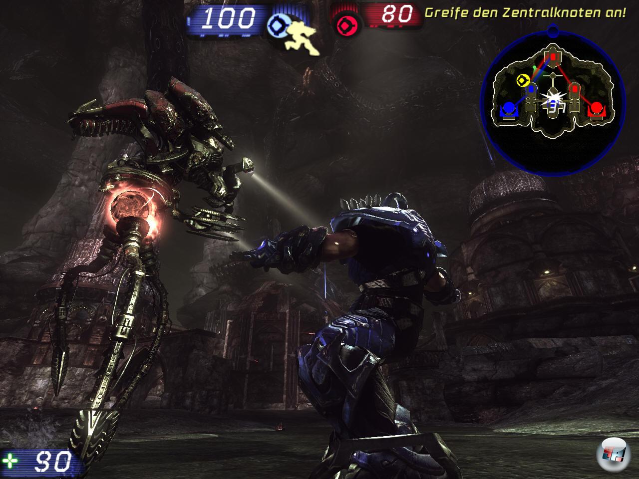 Neu und furchtbar ist die deutsche Sprachausgabe. Obwohl, so neu ist die gar nicht – schon die Sprecher im Vorgänger sorgten für rote Gesichter und beschämte Griffe zum Lautstärkeregler. Immerhin wird eine Runde nicht mehr mit »Anstoß!« eröffnet, dafür geht es jetzt mit »Spielen!« los. Der erste Treffer sorgt für »Erstes Bluuuuuuuut!«, ein paar Frags später befindet man sich im »Blutraaaaaaaausch!«. »Greife deinen Primärknoten an!« ist mir ein bisschen zu persönlich, aber es ist gut zu wissen dass ein »Feindlicher Kugelträger naht«. Kurz vor dem Ende einer Runde gibt’s noch eine »Fünfminutenwarnung«,