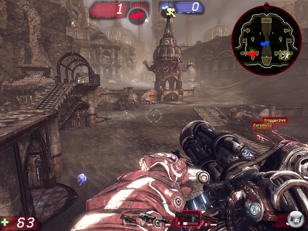 Genau wie eine Maßstäbe setzende Grafik – und auch in diesem Punkt enttäuscht UT 3 nicht: Die neueste Version der Unreal-Engine liefert prächtige Bilder, detailreiche 3D-Modelle, coole Effekte (persönlicher Favorit: der spontan einsetzende Sandsturm) und exzellent designte Figuren, auch wenn man die nur selten aus der Nähe zu sehen bekommt – dafür ist das Spielprinzip einfach zu schnell und zu fraglastig. Ganz besonders gelungen sind die Vehikel der Necris: Einen Darkwalker butterweich animiert durch die Levels stapfen und feurigen Tod verteilen zu sehen ist ein beeindruckendes Erlebnis. Als Vergleich muss erneut Gears of War herausgekramt werden: Diese Qualität gibt’s zu sehen, minus der großen Levels – die hiesigen Arenen sind logischerweise kleiner und in sich geschlossen. Davon gibt es 42, von denen gut die Hälfte ausdauernden UT-Spielern bekannt vorkommen dürfte. Der Rest ist neu, wobei die Qualität zwischen »Brillant designt!« und »Puh, wo ist die Landkarte?« schwankt – es hat schon seinen Grund, warum immer wieder mal eine gut sichtbare Leuchtpfeilspur z.B. zur gegnerischen Flagge ins Bild gelegt wird. Die letzte Neuerung betrifft den Longbow-Werfer – eine Art Raketenwerfer, der sich als hervorragendes Mittel gegen kleinere Fahrzeuge erwiesen hat. Den Rest des Arsenals, von Minigun über Flak-Cannon bis zur Bio-Gun, kennt man bereits.