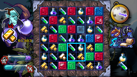 Bin ich ein Vampir? Wahrscheinlich schon. Irgendwo auf dem Titelbildschirm versteckte sich jedenfalls einer der Blutbeißer hinter seinem Mantel – wenn ich mich recht entsinne. Und irgendwie deuten auch die Hintergrundbilder, diese Spinne, der Zombie oder die aus unheilvollen Zutaten gebrauchten Tränke daraufhin. Mehr weiß ich aber nicht. Story? Gibt’s nicht. Witzige Sprüche? Gibt’s nicht. Es gibt nur immer wieder drei Levels, die alle gleich aussehen. Dann einen Bonuslevel, der genauso aussieht. Dann drei neue Levels, die aber wieder alle gleich aussehen. Puzzle Quest? Gibts hier nicht.