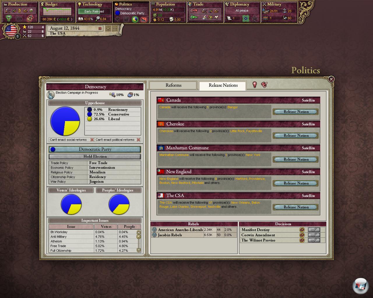 Sonst bestimmt man hauptsächlich, welche Partei mit einem regiert. Das ist das Recht der Königs, Fürsten bzw. Präsidenten, der sich nicht selbst der Wahl stellen muss. Wechselt die Parlament, arbeitet er mit der neuen Fraktion zusammen. Es gibt zwar Ober und Unterhaus, aber die Aufgaben nicht immer klar. Eigentlich zählt eher das Oberhaus, mit dem sich auch Reformen durchführen lassen, wenn man die Mehrheit hat. Obwohl sich die Volksmeinung im Spielverlauf immer mehr Richtung Freiheit, Demokratie und Menschenrechten dreht, verändert sich wenig, so dass die Politik ein wenig statisch erscheint. Für Autokraten wie den russischen Zar mag das ja stimmen, aber nicht im pluralistischen Großbritannien, Frankreich oder den USA.