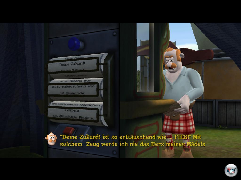 Die Dialogrätsel nehmen bei Wallace & Gromit seit jeher einen nicht ganz unwichtigen Teil ein. Letztes Mal musste man die Kioskbesitzerin aufbauen, dieses Mal ist der Schottenhammel dran, der Mrs. Flitt mit einem Gedicht beeindrucken möchte. Weil er aber beileibe kein Poet ist, lässt er sich von einem Automaten inspirieren. Der liefert Glückskekse, die voller Wahrheit stecken. Als Gromit hinter die Wahrsagerin blickt, muss er schließlich selber ran. Der Spieler muss McBiscuit einen passenden Spruch liefern, den man aus Textbausteinen zusammensetzen muss. Da sind eher Qualitäten in Sachen Trial and Error gefragt als vertiefte Kenntnisse in Englisch, da deutsche Untertitel fürs nötige Verständnis sorgen. Die Sprachausgabe ist original auf Englisch.