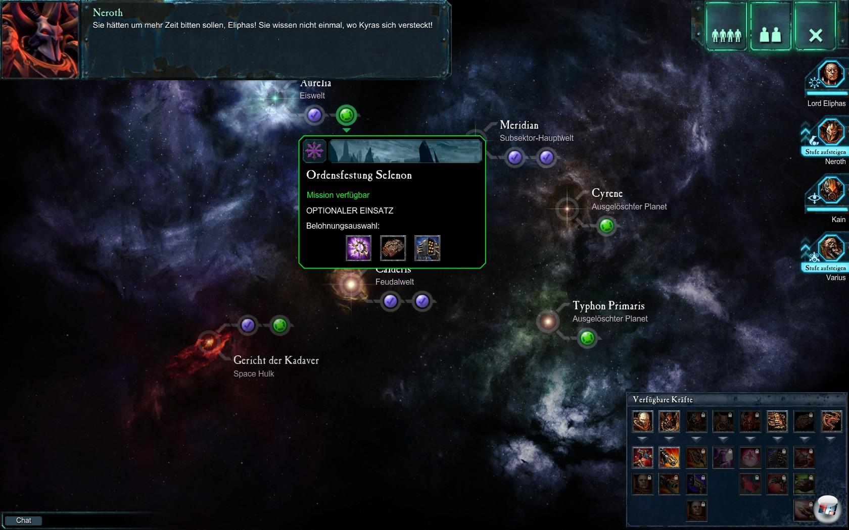 Welche Mission ihr als nächstes bestreiten wollt, entscheidet ihr auf der Weltraumkarte. Es gibt Story- und Nebenmissionen, wobei sich die Anzahl der optionalen Einsätze in Grenzen hält, aber immerhin sind diese vorhanden. Während im Hintergrund oftmals die Protagonisten in Portraitform über die Geschehnisse quatschen, verwaltet ihr auf der Sektorkarte eure Helden bzw. die Armee. Ihr verteilt in den Missionen gesammelte Ausrüstung (Waffen, Panzerung, Relikte und Co.) an eure heroischen Kampfmaschinen und entscheidet in welche Richtung sie weiterentwickelt werden sollen.