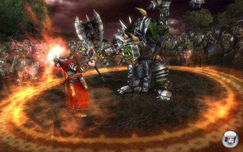 Bei Mark of Chaos ließen sich die Grünhäute nur als Söldner anheuern und mit Battle March dürft ihr sie selbst kommandieren – das spart natürlich Arbeit, wenn man vorgefertigte Einheiten recyceln kann. Hierbei dürfen sich Ork-Freunde auf die einmalige „Waaagh!“-Sprache der „Grünen Flut“ freuen, bestehend aus Schwarzorks, Wildschweinjungz, Schamanen, Steinschleudaz, Speerwerfer, etc. Der Story-Feldzug beginnt damit, dass ihr zunächst die anderen Stämme vereinigt und ihnen zeigt „waz wir draufhab’n Jungz“, um letztendlich gemeinsam gegen Zwerge (Orkisch: Stumpenz) und das Imperium (Orkisch, z.B. Menschis) in den Krieg zu ziehen, wobei die deutschen Synchronsprecher ruhig stärker ins Mikro hätten grunzen können; hier geht Flair verloren, was kombiniert mit den ohnehin schwachen Zwischensequenzen stärker ins Gewicht fällt.
