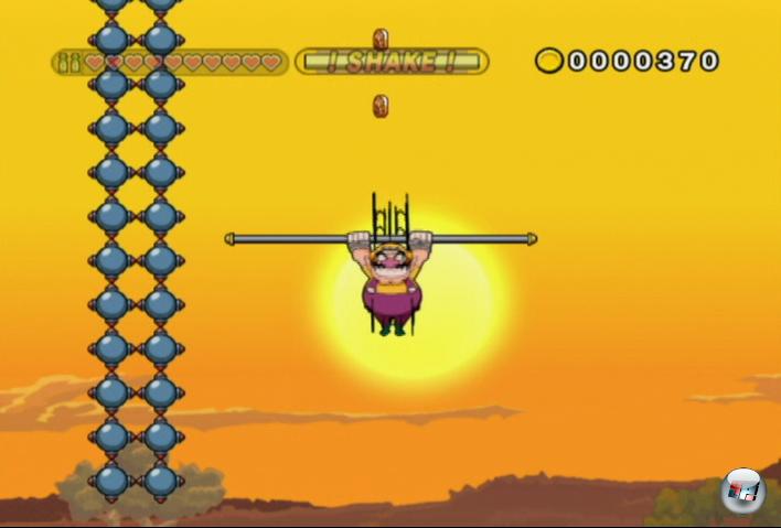 moderner 3D-Spiele noch kein Thema waren. Klar, die Grafik ließe sich wahrscheinlich auch mit leichten Abstrichen auf einem DS oder SNES realisieren, aber das Gesamtbild ist mit dem butterweichen Parallax-Scrolling sowie teilweise urkomischen Animationen des Haupt-Akteurs retro und umwerfend zugleich. Vor allem der Abwechslungsreichtum auf den fünf Kontinenten weiß zu gefallen: Mal geht es bei glühender Hitze durch die staubige Wüste, ein anderes Mal kämpft ihr euch bei Gewitter durch einen düsteren Dschungel oder besucht die an Las Vegas erinnernde Glitter City, in der ihr an Spielautomaten euer Item-Glück versucht und Plattformen erst beim Scheinwerferlicht sichtbar werden. Dazu gesellen sich Ausflüge in eine Winterwelt, in der Wario auch als Schneeball eine gute Figur macht, oder einen fahrenden Zug, dessen Triebwerke ihr zerstören müsst. Schließt ihr die Wii über einen 16:9-Fernseher an, müsst ihr allerdings mit einem Rand rechts und links leben, der nicht unbedingt sein müsste. Warum kann man das Spiel nicht auch unter 16:9 im Vollbild anzeigen? Deshalb mein Tipp: Belasst es auch an einem 16:9-TV bei der 4:3-Einstellung und genießt die Vollbild-Darstellung, wenn auch leicht gestreckt. Begleitet werden eure Hüpfeinlagen von groovigen Soundtracks, die zwar teilweise an MIDI-Gedüdel erinnern, aber den Retro-Charme ebenfalls wunderbar einfangen und unwillkürlich zum Mitwippen einladen. Und was wäre ein Wario-Spiel ohne Vehikel? Auch in der Shake Dimension erforscht ihr einige Abschnitte unter Wasser mit einem U-Boot oder begebt euch mit einer Düsenkapsel über die Wolken. Selbst einen der Bosskämpfe tragt ihr mobil aus und rast um die Wette, während ihr mit einer Boxhandschuh-Vorrichtung so lange Schraubenschlüssel und Reifen in den Motor eures Konkurrenten pfeffert, bis dieser endlich hochgeht.