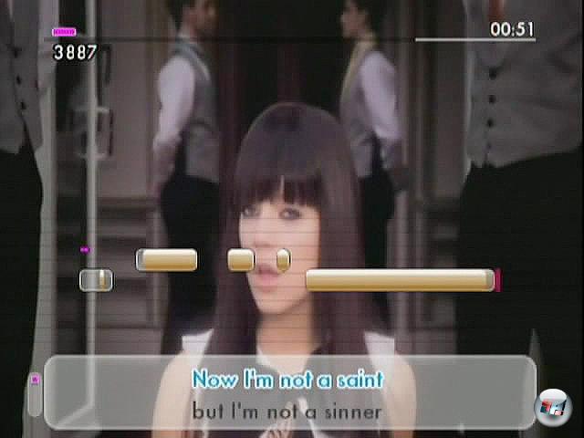 Als Ausgleich sorgt man zumindest dafür, dass in den eigenen vier Wänden Partystimmung aufkommt, denn hier dürfen bis zu vier Sänger mit eigenen Mikrofonen gleichzeitig loslegen. Da die Wii bekanntlich nur zwei USB-Ports bietet, liegt dem Spiel ein Hub bei, mit dem man bis zu vier Geräte anschließen kann. Damit auf dem Bildschirm nicht das Chaos mit zig Tonhöhen-Linien ausbricht, hat man sich dazu entschieden, schon bei zwei Spielern nur einen Indikator anzubieten, der für alle gültig ist. Ausnahmen bilden hier lediglich echte Duette mit zwei unterschiedlichen Stimmlagen, bei denen jeder Spieler wie gewohnt seine eigene Spur bekommt. Der Übersicht kommt dieses Verfahren sicher zugute, doch gerade mit vier Sängern vermisst man das visuelle Feedback, wie gut oder schlecht man sich gerade schlägt und wo man die Fehler macht. Einzig der Blick auf den Punktestand ist ein Indiz für die eigene Leistung. Wer aber glaubt, bei Songs wie „Don’t Cha“   |