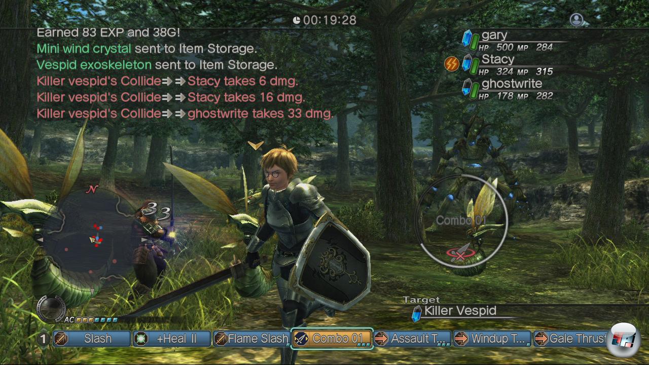 Die Kämpfe werden ähnlich wie in Final Fantasy XII <a class="DYNLINK" onmouseover="DynToolTipp_Show('Klicken für Gameinfos‚)“ onmouseout=“DynToolTipp_Hide(); “ href=“javascript:DynCont_Display(‚Gamefinder‘,’runmod.php?sid=%7BSID%7D&LAYOUT=dyncont_gf&spielid=2280′)“> an Ort und Stelle in Echtzeit ausgetragen – nur ohne optionalen Gambit-Komfort. Es lassen sich mehrere Gegner zusammenrotten, in der Nähe herum streunende Monster können auf euch aufmerksam oder von Kameraden herbei gerufen werden und man kann jederzeit sein Heil in der Flucht suchen bis die Verfolger ablassen. Die Kampfsteuerung ist nicht direkt, sondern menübasiert und man steuert immer nur einen Charakter selbst, den man aber jederzeit wechseln kann. Am unteren Bildschirmrand befindet sich eine mehrstufige Aktionspalette, die individuell mit waffenspezifischen Angriffen, Zaubern und anderen Fertigkeiten belegt werden darf. Auch der Einsatz von Items oder das Verwandeln in den Namen gebenden weißen Ritter wird über entsprechende Aktionsleisten ausgeführt. Anfangs ist der vorhandene Platz für eigene Aktionen mehr als ausreichend, später wird’s aber ziemlich eng und man muss sich quasi auf bestimmte Rollen festlegen, um jederzeit Herr der Lage zu bleiben.