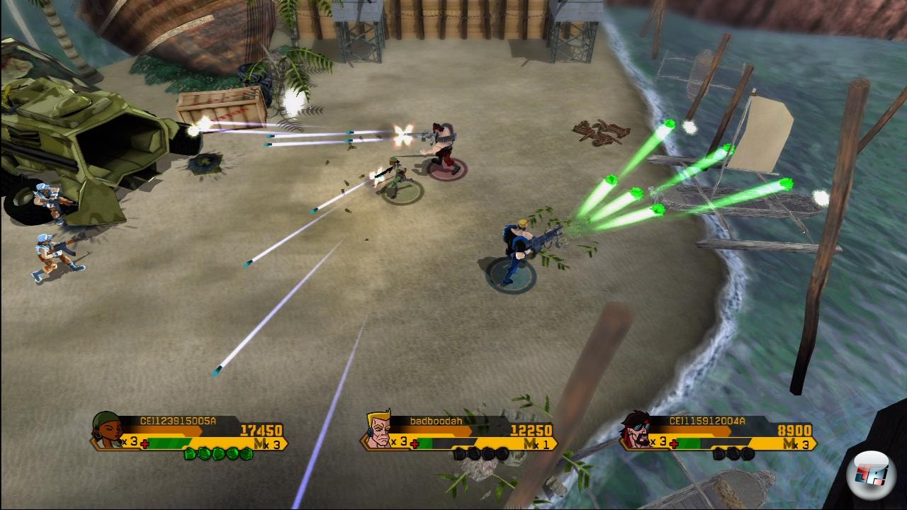 Technisch ist WOTB für einen Arcade-Titel ganz nett – etwa eine Stufe unter Assault Heroes 2, etwas blasser und mit weniger Details. Die Figuren sind in einem putzigen Comicstil gehalten, der auch in den Zwischensequenzen weitergeführt wird. Die Umgebung ist zum Teil zerlegbar, die Explosionen rummsen ansehnlich – lediglich das Wasser wird ausnehmend hässlich dargestellt; das Glitzerzeug erinnert eher an eine Plastikfolie mit Gänsehaut als an erfrischendes Nass. 360-Käufer bekommen übrigens einen Mehrwert fürs Geld: Zückt ihr die 800 MS-Punkte für WOTB, dürft ihr euch auch eine Beta-Version von Super Street Fighter 2 HD <A class=DYNLINK onmouseover="DynToolTipp_Show('Klicken für Gameinfos‚)“ onmouseout=“DynToolTipp_Hide(); “ href=“javascript:DynCont_Display(‚Gamefinder‘,’runmod.php?sid={SID}&LAYOUT=dyncont_gf&spielid=15683′)“>