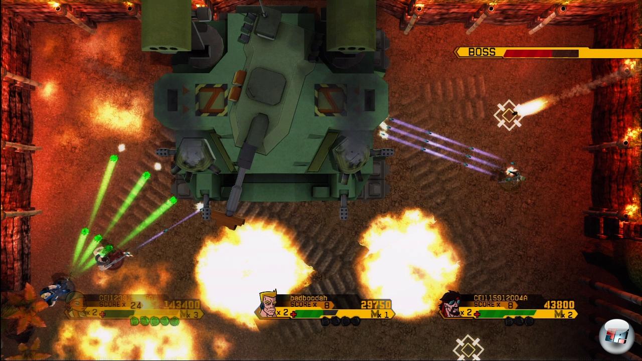 Die Steuerung folgt dem mittlerweile bewährten Robotron-System: Mit dem linken Stick steuert ihr euren Protagonisten, mit dem rechten feuert ihr in alle Richtungen, was auch ganz wunderbar funktioniert. Zum Krampf wird die Kontrolle erst, sobald Vehikel ins Spiel kommen: Zwar könnt ihr mit Panzer und Jeep verheerende Schäden anrichten, außerdem wird der Bildschirm gerade beim Drei-Mann-Spiel mit herrlich chaotisch vielen Geschossen gefüllt. Ändert aber nix daran, dass sich die Fahrzeuge einfach furchtbar unpräzise steuern lassen – unser Rennspielgott Michael hatte beim Test mittelgroße Tränen der Verzweiflung in den Augen. Natürlich muss man die Vehikel nicht benutzen, aber logischerweise machen sie das Spiel leichter. Und man nimmt jede Erleichterung dankend an, denn WOTB ist schwer, richtig schwer. Das mag am Anfang nicht so wirken, wird aber spätestens dann offensichtlich, wenn alle Leben weg sind, General Ratiev bitterböse lacht und ihr wieder im Hauptmenü landet: Oldschool-Design bedeutet eben, dass beim Game Over