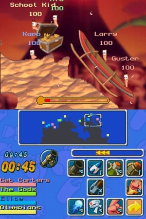gibt es hier eine fummelig zu steuernde Übersichtskarte auf dem Touchscreen, außerdem könnt ihr hier mit dem Stylus aus den Waffen wählen. Dazu ertönen gute Musik (inkl. der stets irgendwie präsenten, allseits bekannten Worms-Titelmelodie) sowie schöne und krachende Soundeffekte.