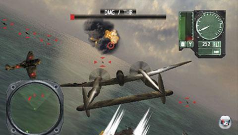 Nach ein paar Minuten im Tutorial habt ihr die kinderleichte Steuerung verinnerlicht. Selbst, wenn ihr euch vor einem Level nicht für den Fighter, sondern für den etwas trägeren Standard-Bomber entscheidet, navigiert ihr ihn behände durch den mit erstaunlich realistisch-fluffigen Wolken verhangenen Himmel. Loopings dürft ihr leider nicht drehen, also geht es erst einmal in die entgegengesetzte Richtung, im Sturzflug nach unten zur Wasseroberfläche, die ebenfalls ansehnlich schimmert. Nun gut – die beschriebenen Wüsten und Wälder wirken nur aus der Höhe einigermaßen ansehnlich, sehen für PSP-Verhältnisse aber durchaus brauchbar aus.