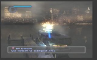 Fliegender Feuerwehrmann: Als Iceman gleitet ihr gemächlich durch die Lüfte, löscht Brände und zerbröselt unterbelichtete Gegner (PS2).