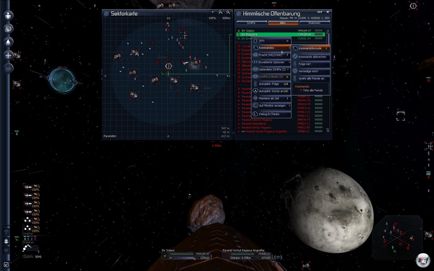 | Eure weiteren Schiffe könnt ihr mit Kommandos wie „Folge mir“, „Verteidige mich“ oder „Greife den Feind an“ befehligen. |