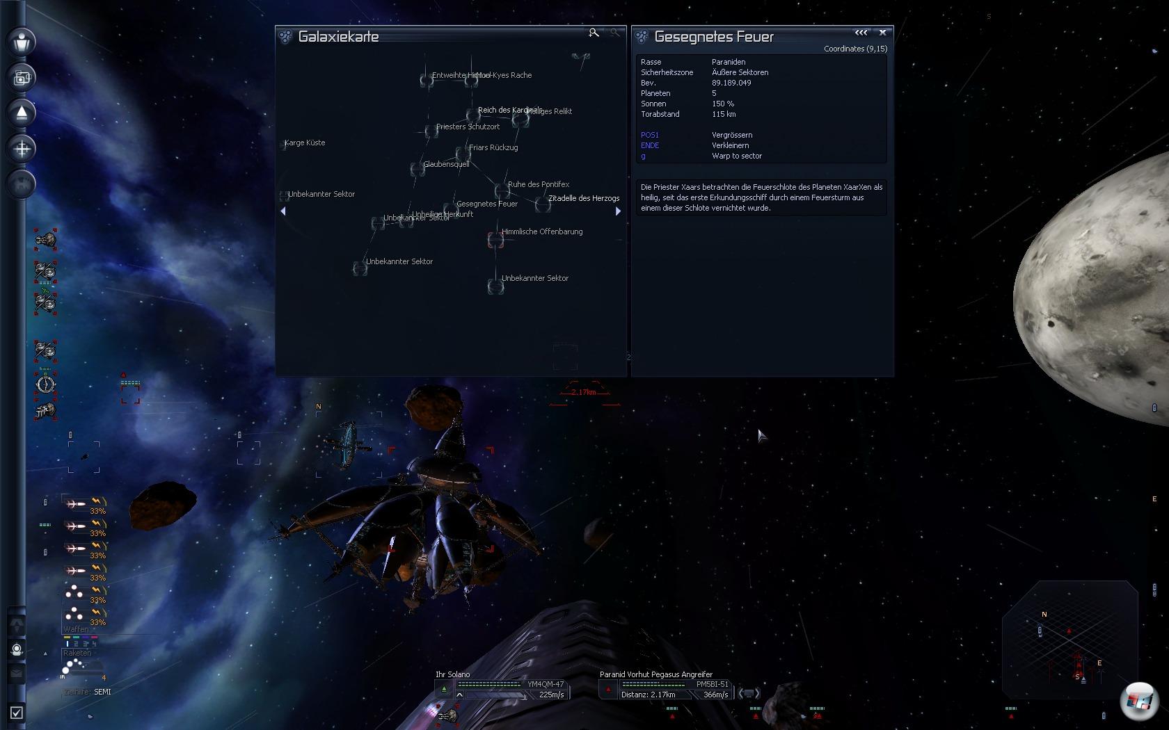 Mit dem verschachtelten und umständlichen Interface der Marke Menüdschungel schlagen sich Entwickler und Spieler seit dem Anfang der Serie herum. Bei Terran Conflict hat sich Egosoft nun eine Kontrollleiste an der linken Seite mit den wichtigsten Funktionen in hierarchischer Struktur einfallen lassen, die man mit der Maus problemlos bedienen kann, während das Schiff entweder per Autopilot fliegt oder der Nase nach tuckert. Mit der